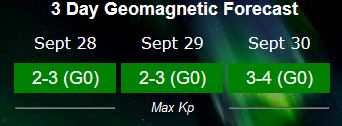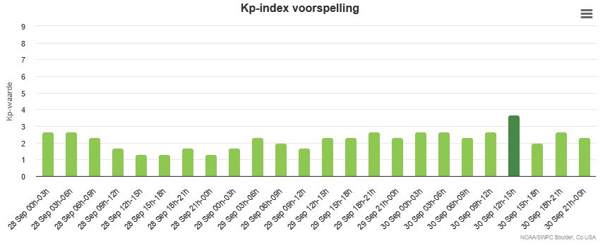 Afb: Dit zijn de verwachtingen voor de komende dagen voor de Kp-index en mogelijke zonnestormen. Voor onze tijd tel +2 uur op bij de tijd. Het ziet er mild uit voor de komende dagen.