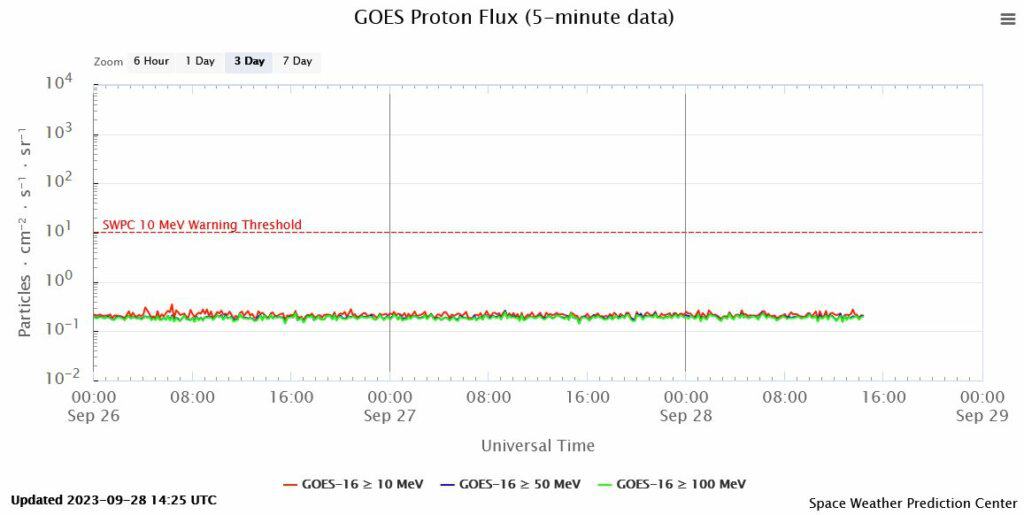 KORTE OMSCHRIJVING VERSTORINGEN: Er zijn GEEN verhoogde protonen op donderdag 28-9. Er is wel een kans op verhoogde protonen van ongeveer 10%. Dus niet zo’n hoge kans.