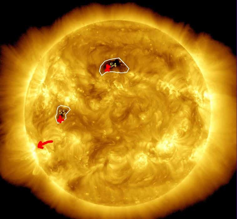 Afb: Zon van donderdag 28-9. Er is 1 rode pijl van de meest actieve zonnevlek, vanaf de rand van de Zon. De vakjes met witte lijnen er omheen en nrs er in, dat zijn de gaten in de corona van de Zon. Die links bovenaan heb ik ingetekend, want die is er wel, maar nog niet ingetekend door de experts.