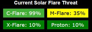 De Zon is rustiger dan verwacht, met vanaf dinsdag alleen maar C-klasse zonnevlammen, terwijl de verwachting voor hoge zonnevlammen heel erg hoog was, omdat er een actieve zonnevlek op de aarde gericht stond. Inmiddels is die actieve zonnevlek zijn kracht kwijt. Op donderdag rond 11:00 uur was er een M-klasse zonnevlam vanaf de rand van de Zon afkomstig van een nieuwe zonnevlek. Dus die kan meer grotere zonnevlekken voortbrengen de komende dagen. Er is nog wel een GROTE ZONNEVLAMMEN ALERT, met 35% kans op M-klasse zonnevlammen en 10% kans op X-klasse zonnevlammen. Maar dat is normaal voor deze mate van activiteit in de cyclus van de Zon.