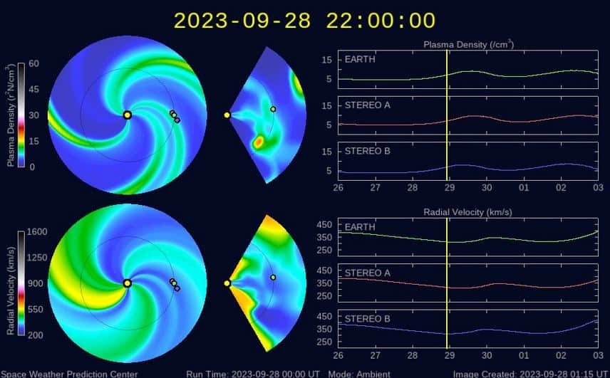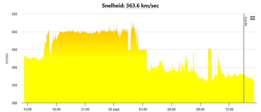 Afb: Dit is een weergave van de zonnewind snelheid. Voor onze tijd tel +2 uur op bij de tijd.