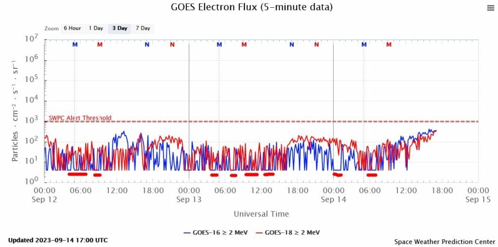 Elektronencrashes maken situaties altijd intenser in het gevoel, omdat je alles veel zwarter ziet dan het is. Maar dit zijn gelukkig milde elektronencrashes. Op dinsdag 12-9: tussen 6:00 en 9:00 uur en op 13-9 steeds hele korte periode met milde elektronencrash tussen 5:30 en 6:30 uur & tussen 9:00 en 10:00 uur & tussen 14:40 en 15:30 uur. En op donderdag 14-9 tussen 2:00 en 3:30 uur en opnieuw tussen 7:30 en 9:00 uur. Buiten deze periode is de situatie neutraal met de elektronen in de ionensfeer. De verwachting is dat de elektronencrashes vanaf donderdagavond voorlopig weer voorbij zijn en dat de situatie rond de elektronen neutraal zullen zijn voor de komende dagen.