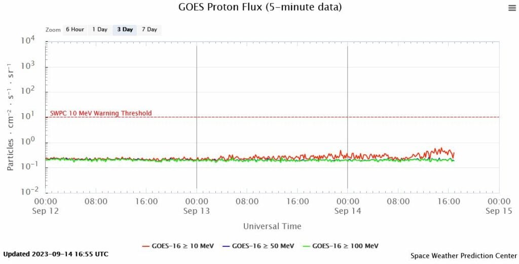 De protonen waren op normale waarden en gingen woensdag 13-9 in de nacht rond 7:00 uur heel erg mild omhoog. En opnieuw nog wat hoger dan woensdag vanaf 12:00 uur. Dit was de M-klasse zonnevlam die rond 9:40 uur X-ray zonnevlam onze kant op stuurde. Deze protonen zijn de protonen van de CME die aankwamen. Maar deze verstoring is VERWAARLOOSBAAR, alleen zeer mild voelbaar met symptomen.