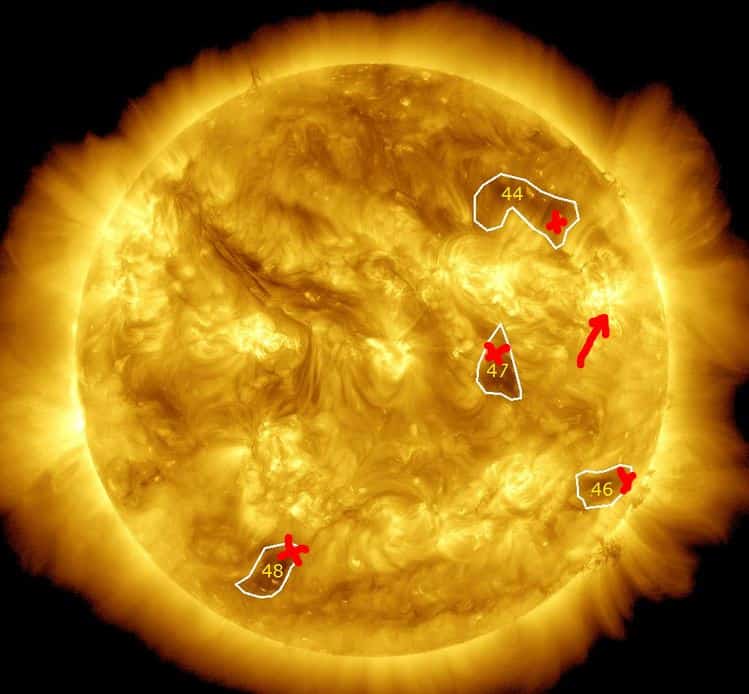 Afb: Zon van donderdag 14-9. Rode pijlen zijn de meest actieve zonnevlekken, beide deels op de aarde gericht. De vakjes met witte lijnen er omheen en nrs er in, dat zijn de gaten in de corona van de Zon.