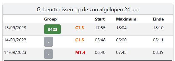 Afb: Dit zijn de X-ray zonnevlammen die gemeten zijn door de satelliet. Er was ook nog een hogere C-klasse zonnevlam C-4.69 rond 17:30 uur, maar die staat nog niet in de lijst. Voor onze tijd tel +2 uur op bij de tijd.