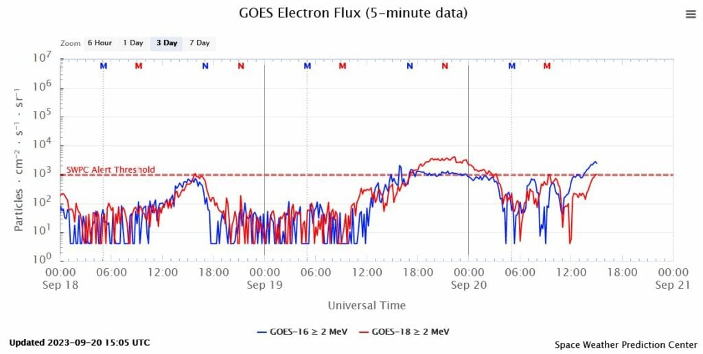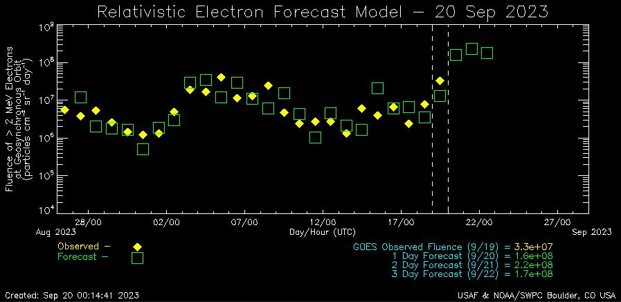 Even nog een kort overzicht van de huidige verstoringen van woensdag 20-9: In de avond en nacht tussen 19:00 en 5:00 uur en opnieuw vanaf 14:00 uur waren er elektronenstormen (hoogfrequente elektrische energie). Dinsdagavond 19-9 was er een hoge zonnevlam M-4.09 van een zonnevlek die nog net niet op de aarde gericht staat, maar vanaf morgen donderdag 21-9 wel. Deze is ook flink aan het groeien in kracht. Er was rond 00:30 uur nog een hoge C-klasse C-9-78 door deze zonnevlek en rond 16:10 uur een zeer hoge X-ray zonnevlam M-8.23, dat is bijna een X-klasse zonnevlam. Dus deze zonnevlam gaat ons de komende week meer activiteit brengen. Er is wel weer een GROTE ZONNEVLAM ALERT met 40% kans op M-klasse zonnevlammen.