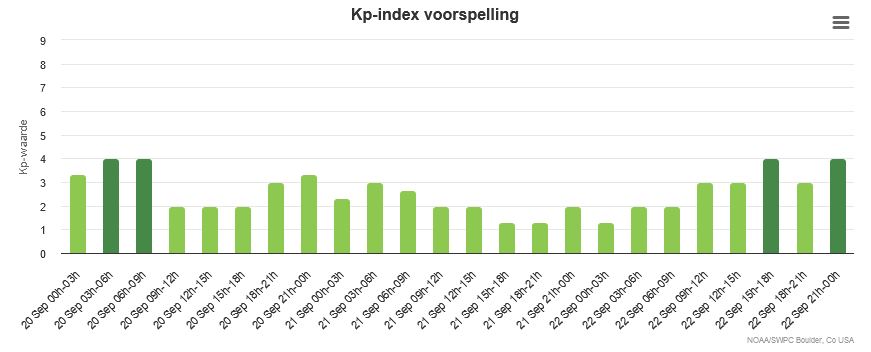 Afb: Dit zijn de verwachtingen voor de komende dagen voor de Kp-index en zonnestormen. Voor onze tijd tel +2 uur op bij de tijd. Het ziet er mild uit voor de komende dagen.