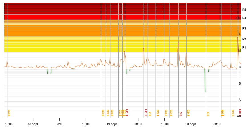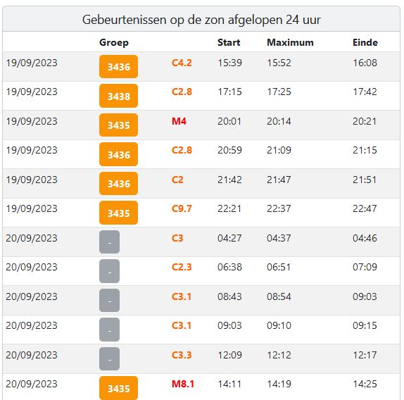 Dinsdagavond 19-9 was er een hoge zonnevlam M-4.09 van een zonnevlek die nog net niet op de aarde gericht staat, maar vanaf morgen donderdag 21-9 wel. Deze is ook flink aan het groeien in kracht. Er was rond 00:30 uur nog een hoge C-klasse C-9-78 door deze zonnevlek en rond 16:10 uur een zeer hoge X-ray zonnevlam M-8.23, dat is bijna een X-klasse zonnevlam. Dus deze zonnevlam gaat ons de komende week meer activiteit brengen. Er is wel weer een GROTE ZONNEVLAM ALERT met 40% kans op M-klasse zonnevlammen. Ik probeer eind van de middag nog een update te maken met grafieken erbij.