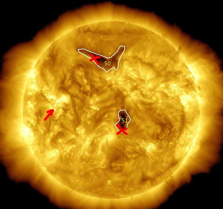 Afb: Zon van woensdag 20-9. Er is nu een rode pijl voor de meest actieve zonnevlek nog net niet op de aarde gericht. De vakjes met witte lijnen er omheen en nrs er in, dat zijn de gaten in de corona van de Zon.