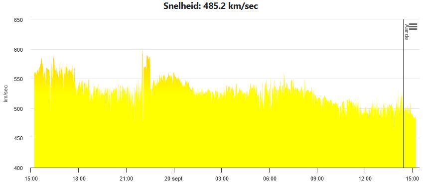 Afb: Dit is een weergave van de zonnewind snelheid op dinsdag 19-9. Voor onze tijd tel +2 uur op bij de tijd.