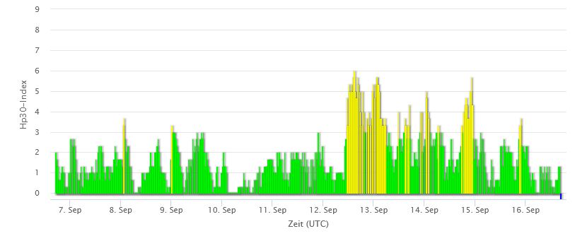 Afb: Dit is de 10 dagen weergave van de reactie van de beschermende magnetosfeer van de aarde op de zonnewind of andere verstoringen en dit geeft zonnestorm weer. Voor onze tijd tel +2 uur op bij de tijd.