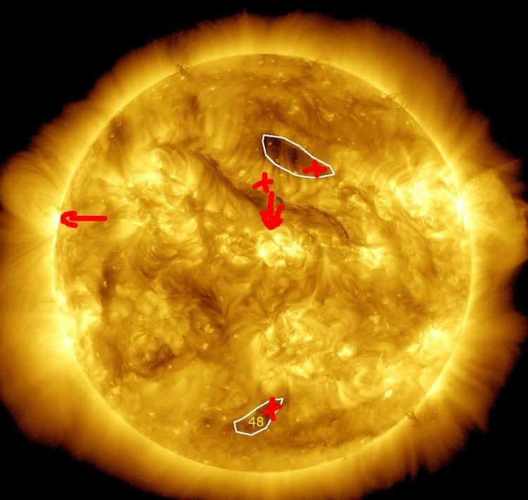 Afb: Zon van zaterdag 16-9. Rode pijl is de meest actieve zonnevlek op de aarde gericht. De vakjes met witte lijnen er omheen en nrs er in, dat zijn de gaten in de corona van de Zon.