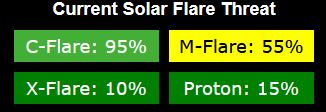 De Zon is weer flink actief met M-klasse zonnevlammen met een actieve op de aarde gerichte zonnevlek, daardoor is er ook extra kans op hoge zonnevlammen met een GROTE ZONNEVLAMMEN ALERT en extra kans op protonenstorm met 15% kans wordt aangegeven, maar ik denk dat deze kans veel hoger is met deze actieve aarde gerichte zonnevlek. Er is een GROTE ZONNEVLAM ALERT met 55% kans op M-klasse en 10% kans op X-klasse zonnevlammen. Als er protonen meekomen bij een getriggerde CME ontploffing, dan wordt een zonnevlam echt heel erg pittig voelbaar met intense symptomen.