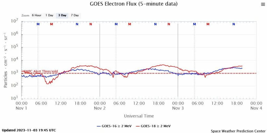 KORTE OMSCHRIJVING VERSTORINGEN: Ook de elektronen worden beïnvloed door de magnetische ompoling van de Zon en laten in de ionensfeer van de aarde vreemde metingen zien de laatste tijd. Normaal gesproken is een elektronencrash (zeer lage elektronen aantallen in de ionensfeer) verbonden met een binnenkomende zonnestorm, maar de laatste tijd zijn er elektronencrashes zonder aanleiding. Ik ben geen specialist die een opleiding hiervoor gedaan heeft, maar voor zover ik weet is er geen echt aanleiding. De veranderingen op de Zon door de poolshift die de Zon gaat maken is wel een aanwijzing, omdat de elektromagnetische currentsheet (HCC) enorm aan het wobbelen is, worden de elektronen beïnvloed door de currentsheet. Meer informatie hierover: https://inzichten.com/special-over-de-situatie-op-de-zon-met-de-aanstaande-poolshift/ SITUATIE VANAF ZONDAG 29-10: Er was een elektronenstorm. vanaf zondag 29-10 rond 17:00 uur en gaat in en uit stormlevel. Dat is nog steeds aan de orde op vrijdag 3-11. De verwachting voor de komende dagen is nog steeds elektronenstorm.