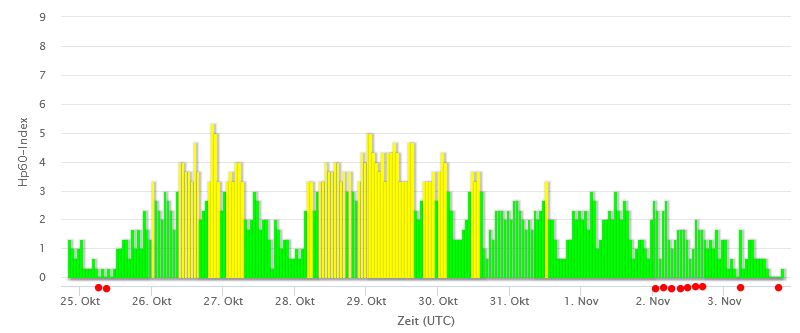 Afb: Dit is de 10 dagen weergave van de reactie van de beschermende magnetosfeer van de aarde op de zonnewind of andere verstoringen en dit geeft zonnestorm weer. Voor onze tijd tel +1 uur op bij de tijd.