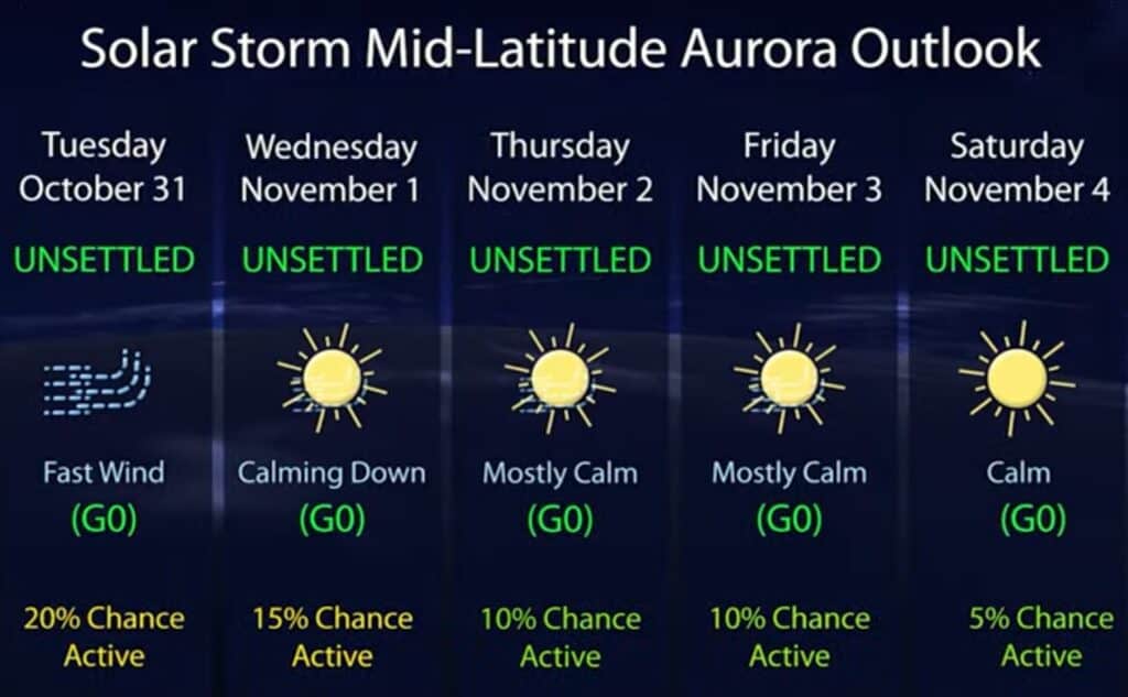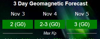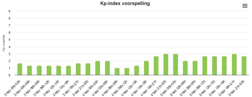 Afb: Dit zijn de verwachtingen voor de komende dagen voor de Kp-index en mogelijke zonnestormen. Voor onze tijd tel +1 uur op bij de tijd. Het ziet er mild uit voor de komende dagen.