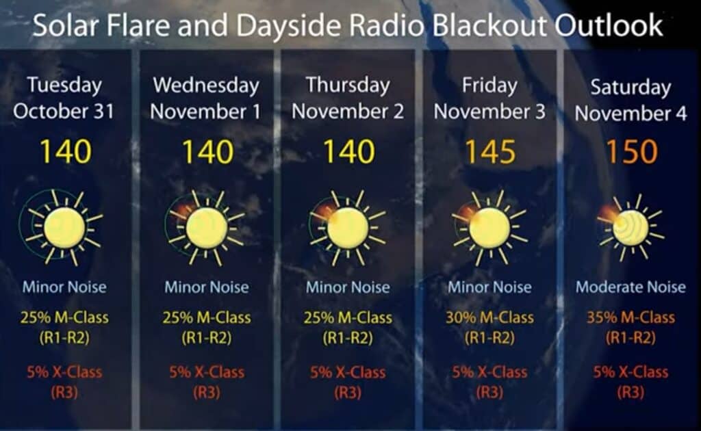Groot gat in de corona van de Zon staan op de aarde gericht. (geven hoge fluittonen in oren). Dit gat staat nog ongeveer tot woensdag 8-11 op de aarde gericht. De verwachting is dat de situatie op de Zon zo zal blijven met toenemende kracht vanaf dinsdag met hogere zonnevlamme, met C-klasse zonnevlam en mogelijk ook M-klasse zonnevlammen (40% kans op M-Klasse zonnevlammen en 5% kans op de hoge X-klasse zonnevlammen), maar verder rustig. Er is EEN GROTE ZONNEVLAM ALERT.