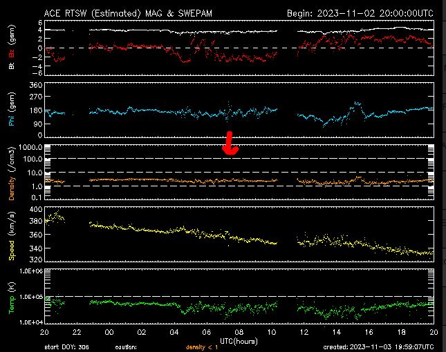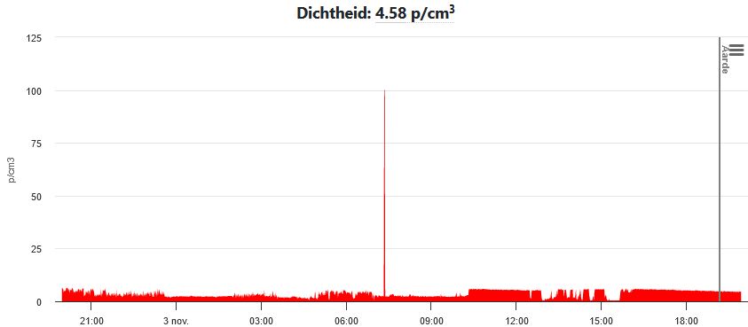 Er was een hoge piek waarschijnlijk X-ray pieken die rond 8:20 uur van ongeveer 100 p/cm3 die zichtbaar werden in de zonnewind dichtheid. Dat zien we vaker als de zonnewind afneemt in kracht en dus de magnetosfeer van de aarde afneemt in kracht. Dan kunnen kosmische invloeden meer gevoeld worden op aarde. (symptomen: Hoogfrequente energie pieken die soms erg moeilijk verwerkt kunnen worden.)