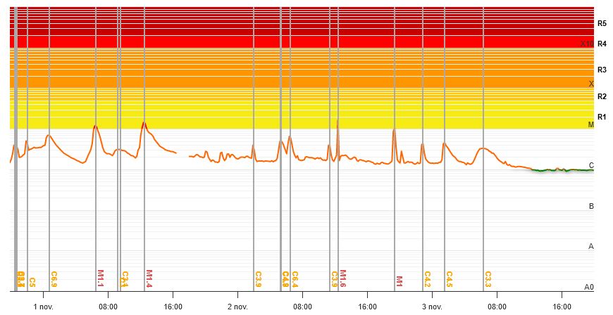 KORTE OMSCHRIJVING VERSTORINGEN: De Zon is al weer aan het toenemen in kracht en dus weer uit de 11 jarige magnetische ompoling aan het komen. Vanaf dinsdagmiddag 31-10 begon de Zon weer meer zonnevlammen te produceren na een tijdje rust. Dit liep op woensdag en donderdag verder op met M-klasse zonnevlammen. Op vrijdag was er rond 6:00 uur een aarde gerichte zonnevlam C-3.3, waardoor er ook een lichte protonen verhoging was tussen 10:30 en rond 20:30 uur was de situatie weer normaal. Dit begon weer af te nemen op vrijdagochtend rond 9:00 uur, waarna er bijna geen zonnevlammen meer waren. Er is EEN GROTE ZONNEVLAM ALERT.