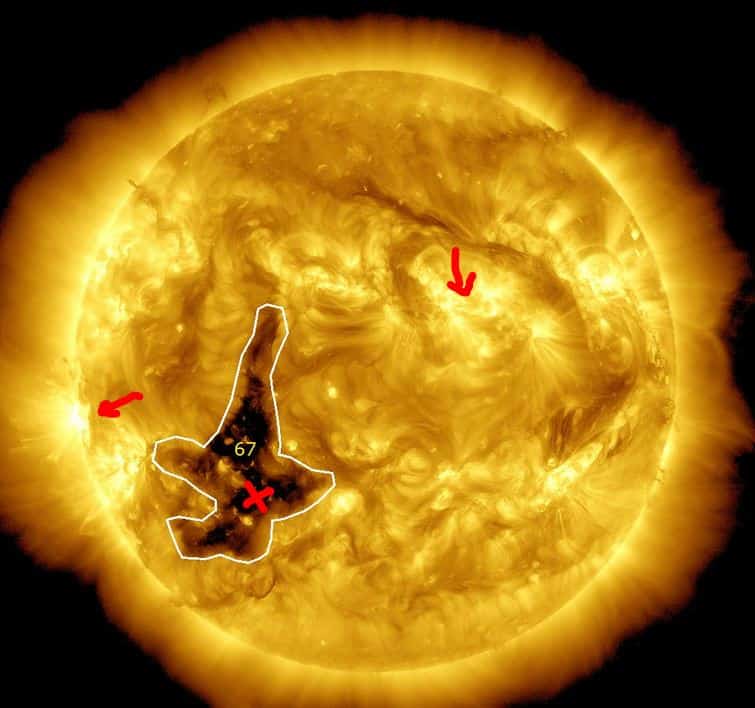 Afb: Zon van vrijdag 3-11. Er zijn 2 rode pijl met de meest actieve zonnevlek vanaf de rand van de Zon, waarvan 1 op de aarde gericht, die ook een CME veroorzaakte vrijdag 3-11 met protonen verhoging. De ingetekende vakjes met witte lijnen er omheen, dat zijn de gaten in de corona van de Zon.