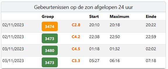 Afb: Dit zijn de X-ray zonnevlammen die gemeten zijn door de satelliet op vrijdag 3-11. Voor onze tijd tel +1 uur op bij de tijd.