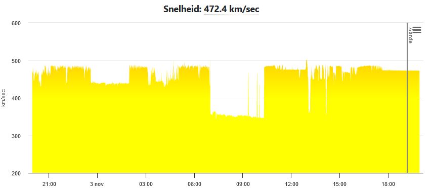Afb: Dit is een weergave van de zonnewind snelheid van vrijdag 3-11. Voor onze tijd tel +1 uur op bij de tijd.
