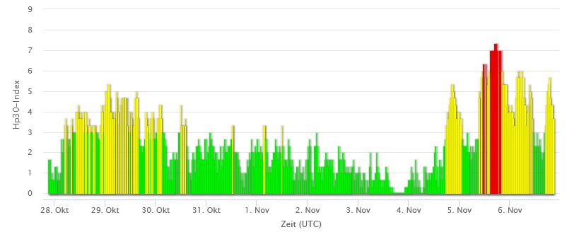 KORTE UITLEG VERSTORINGEN ZONNEWIND: De zonnestorm kwam in 3 losse golven en begon op zaterdagavond 4-11 tussen 18:30 en 2:00 uur. De 2de golf was de heftigste en kwam op zondag 5-11 tussen 10:00 en maandag 12:30 uur met het hoogste punt een G3 zonnestorm Kp-7 tussen 16:00 en 21:00 uur. De laatste golf nr 3 begon op maandag 6-11 rond 18:00 uur en is in de avond nog steeds bezig. Op maandagavond rond 19:30 tot 20:00 uur toch nog kort een Kp-6. En waarschijnlijk ook in de nacht nog wel wat verhoging van de zonnewind. Poeh poeh, dat was een flinke licht instroom die ons een flinke update heeft gebracht. Ik hoop dat je niet te veel last had van de blokkades die niet meer konden trillen. Maar weet dat zo’n licht instroom je helpt om wat geblokkeerd is vrij te maken. Er is zelf in België noorderlicht gezien met prachtige foto’s die overal opduiken.