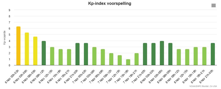 Afb: Voor de komende dagen is er milde verhoging verwacht van de kp-index (reactie magnetosfeer van de aarde).