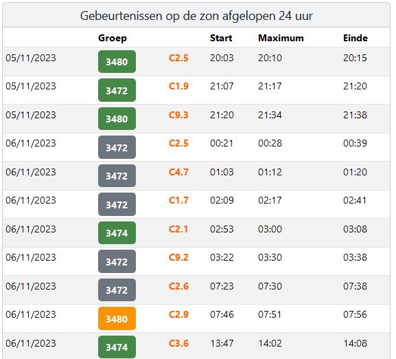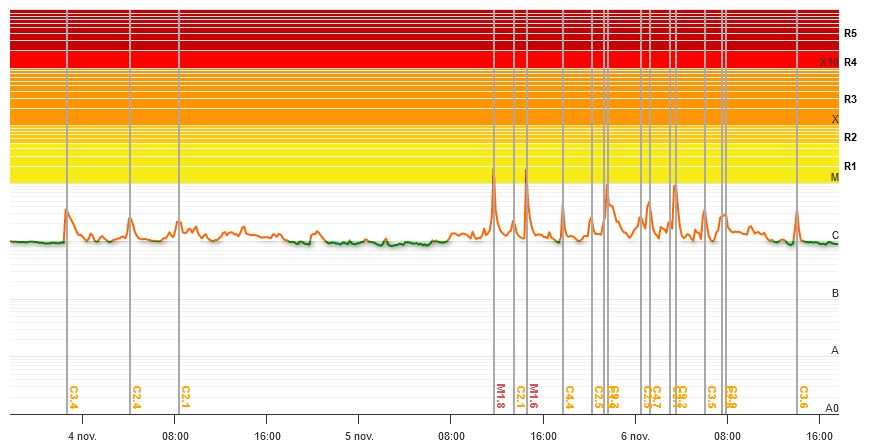 Afb: Dit zijn de X-ray zonnevlammen die gemeten zijn door de satelliet op maandag 6-11. Voor onze tijd tel +1 uur op bij de tijd.