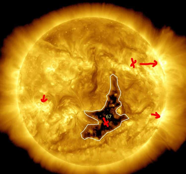 Afb: Zon van maandag 6-11. Er zijn 3 rode pijl met de meest actieve zonnevlek vanaf de rand van de Zon. (met het kruisje erbij produceert de hoogste zonnevlammen.) De ingetekende vakjes met witte lijnen er omheen, dat zijn de gaten in de corona van de Zon.