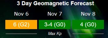 KORTE UITLEG ALLE VERSTORENDE FACTOREN voor MAANDAG 6-11: De zonnestorm kwam in 3 losse golven en begon op zaterdagavond 4-11 tussen 18:30 en 2:00 uur. De 2de golf was de heftigste en kwam op zondag 5-11 tussen 10:00 en maandag 12:30 uur met het hoogste punt een G3 zonnestorm Kp-7 tussen 16:00 en 21:00 uur. De laatste golf nr 3 begon op maandag 6-11 rond 18:00 uur en is in de avond nog steeds bezig. Op maandagavond rond 19:30 tot 20:00 uur toch nog kort een Kp-6. En waarschijnlijk ook in de nacht nog wel wat verhoging van de zonnewind. Poeh poeh, dat was een flinke licht instroom die ons een flinke update heeft gebracht. Ik hoop dat je niet te veel last had van de blokkades die niet meer konden trillen. Maar weet dat zo’n licht instroom je helpt om wat geblokkeerd is vrij te maken. Er is zelf in België noorderlicht gezien met prachtige foto’s die overal opduiken.