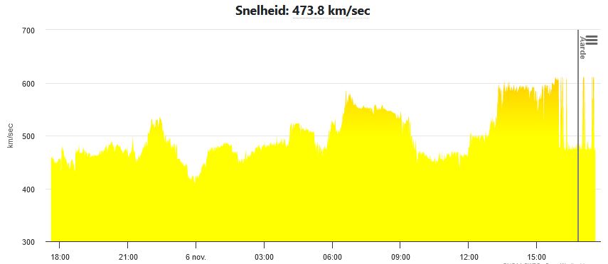 Afb: Dit is een weergave van de zonnewind snelheid. Voor onze tijd tel +1 uur op bij de tijd.