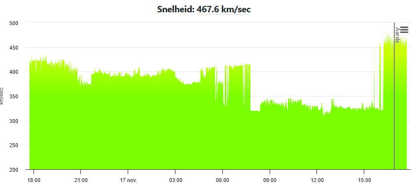 Afb: Dit is de dagelijkse weergave van de zonnewind snelheid. Voor onze tijd tel +1 uur op bij de tijd.