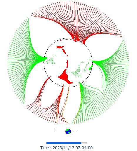 Afb: Dit is de actuele situatie in de magnetische verbinding tussen aarde en Zon van vrijdag 17-11. Voor onze tijd tel +1 uur op bij de tijd.