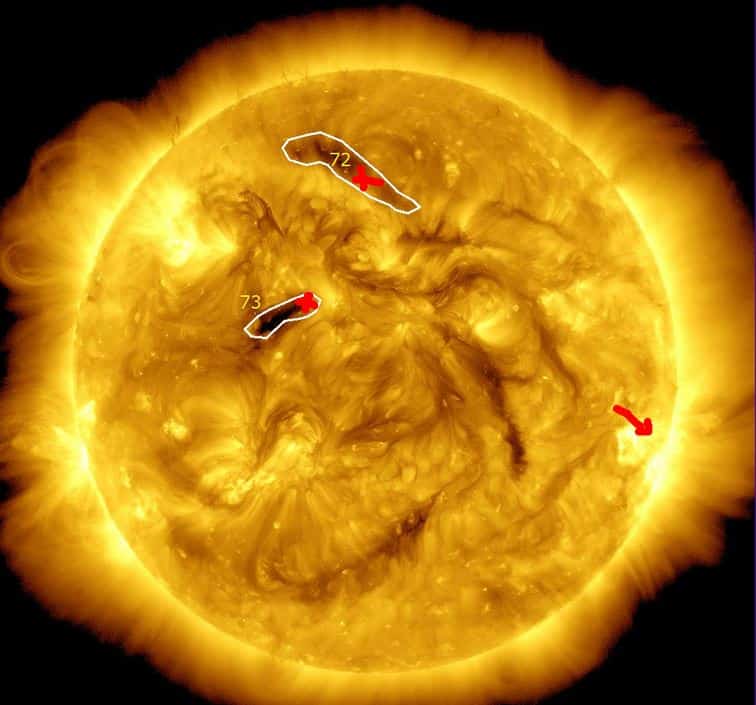 Afb: Zon van vrijdag 17-11. Er is 1 rode pijl met de meest actieve zonnevlek vanaf de rand van de Zon. Dit is een zonnevlek die veel energie oogst en mogelijk toch een M-klasse zonnevlam kan geven, al is die kans erg klein (15%). De ingetekende vakjes met witte lijnen er omheen, dat zijn de gaten in de corona van de Zon.