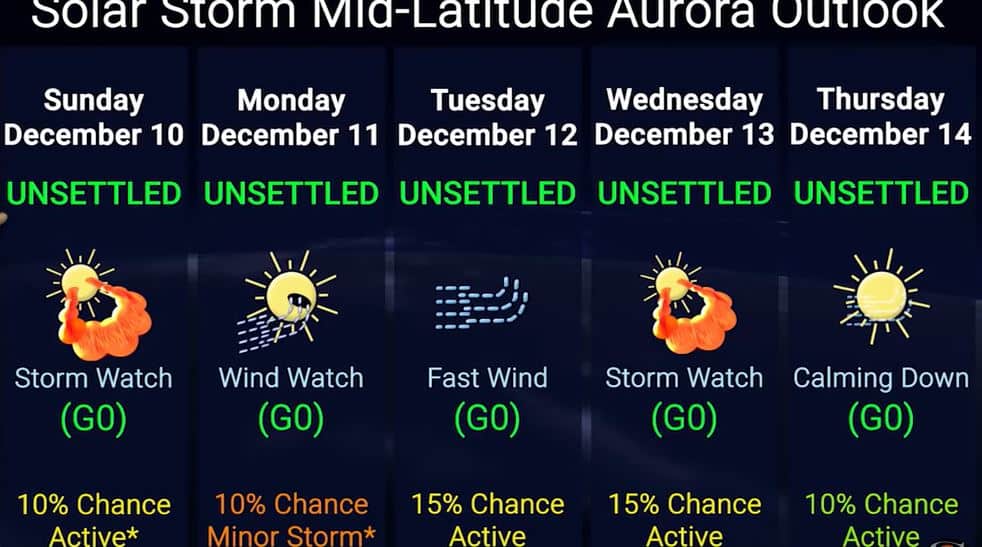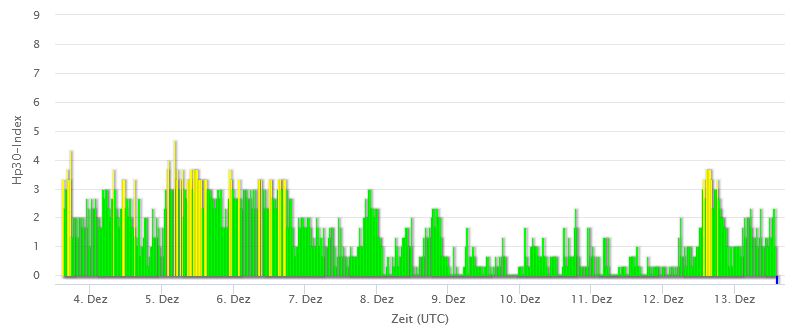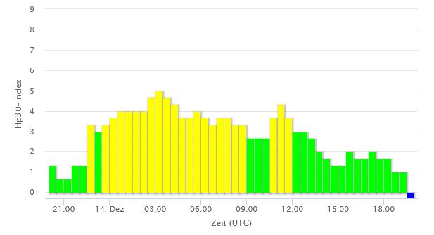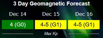 Er was niet echt een zonnestorm verwacht, maar er was een milde reactie van de beschermende magnetosfeer van de aarde tussen 1:30 en 7:00 uur met kp-4, dat is bijna zonnestorm (onrust) en heel kort tussen 4:00 en 4:30 uur was er zonnestorm kp-5. De verwachting is dat er vrijdag 15-12 een zonnestorm zal komen. Het ene vooruitzicht zegt in de nacht rond 4:00 uur en de ander pas rond de middag vanaf 13:00 uur. We gaan het zien.