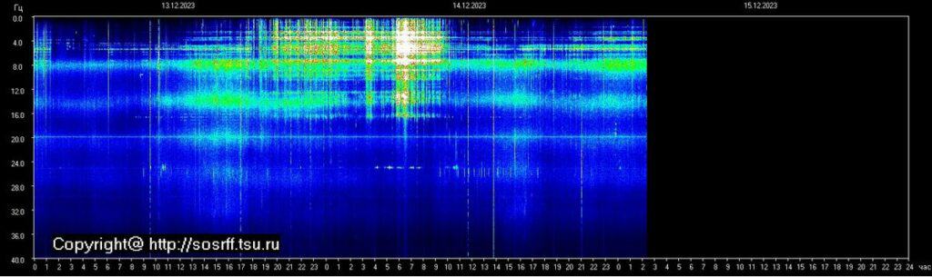 Er was op deze woensdag 13-12 op donderdag 14-12 in de nacht tussen 23:00 en 2:00 uur een gemiddelde Schumannresonantie met de hoogste piek rond 00:30 uur van 25 amplitude. (dus niet extreem hoog) dus gemiddelde intensiteit.