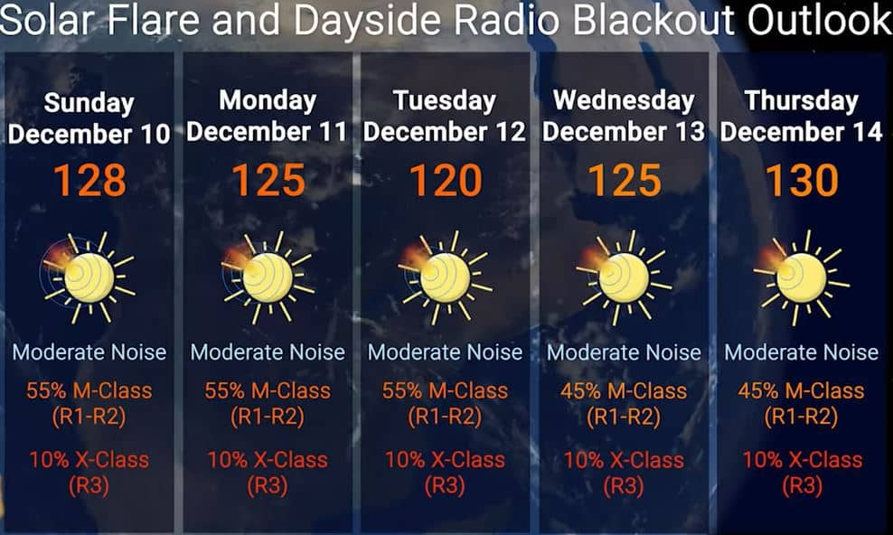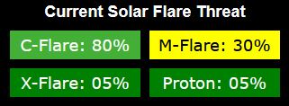 Afb: Dit zijn de vooruitzichten voor de komende dagen voor zonnevlammen. Inmiddels is het allemaal veel rustiger dan verwacht op de Zon en zijn de nieuw zonnevlekken nog mild of nog niet zichtbaar, maar dat kan later weer toenemen.