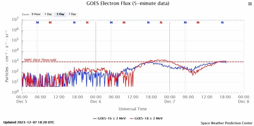 KORTE OMSCHRIJVING VERSTORINGEN: De elektronen zijn vanaf woensdag 6-12 rond 17:00 uur in elektronenstorm. En bewegen vanaf dat moment in en uit- zonnestormlevel. De verwachting is dat de elektronen de komende dagen nog hoger in elektronenstorm gaan.