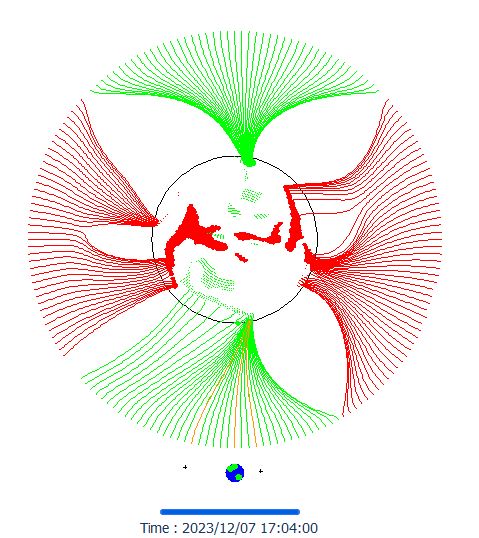 Afb: Dit is de actuele situatie in de magnetische verbinding tussen aarde en Zon van donderdag 7-12. Voor onze tijd tel +1 uur op bij de tijd.