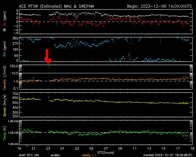 Afb: (Algemene informatie grafiek). Dit is de weergave van de zonnewind gemeten door de ACE satelliet. Zie rode pijl voor de hoge X-ray pieken, de X-ray pieken zijn de kleine puntjes eronder. Bij andere metingen van de zonnewind door andere satellieten, worden deze korte verhoogde zonnewind dichtheid normaal eruit gefilterd (dit keer toch zichtbaar in de onderstaande grafiek). De hoge X-ray pieken worden zichtbaar in de zonnewind dichtheid. (Tel 1 uur op voor Europese tijd.)