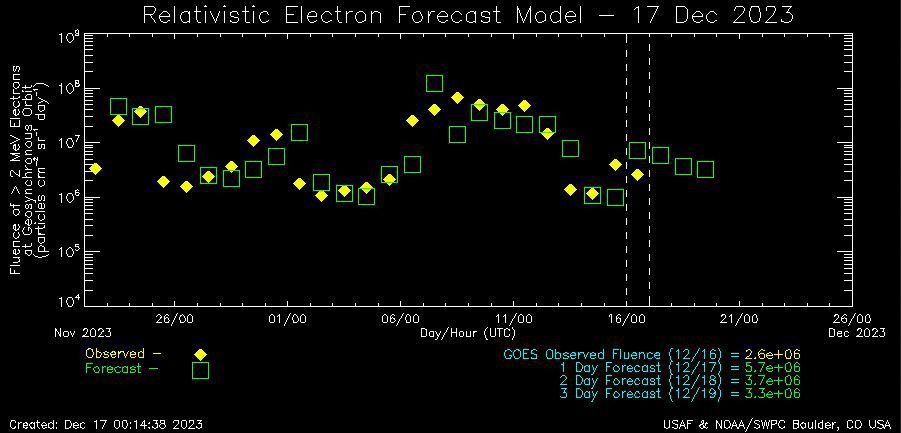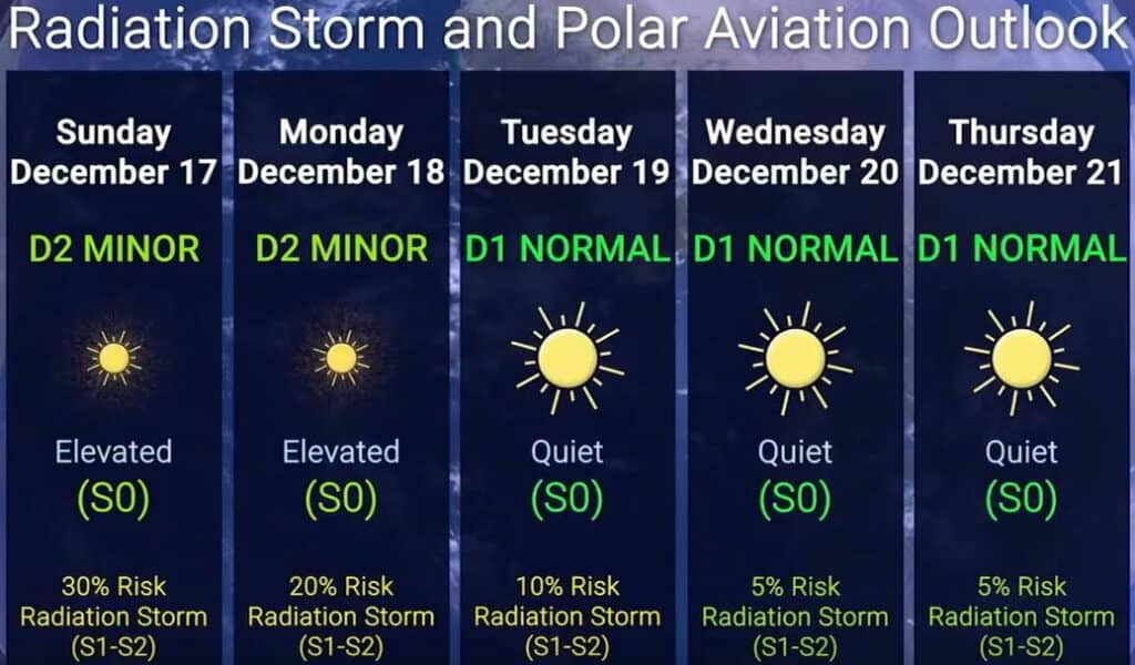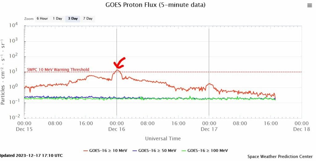 De extreem hoge zonnevlam X-2.87 van donderdag 14-12 bracht een verhoging van protonen op gang. Die bleven heel langzaam, maar alsmaar stijgen en kwamen in stormlevel tussen 00:30 en 2:00 uur op vrijdag 15-12 en gingen daarna weer heel langzaam zakken. De situatie op zondagavond is nog zeer mild verhoogd met de protonen en zal langzaam verdwijnen. Er is wel een kans op verhoogde protonen en protonenstorm van 30% en dat is pittig hoog. Protonen geven dezelfde symptomen als zonnestorm, je voelt deeltje door je heen razen en kan mogelijk misselijkheid en duizelig zijn enz. maar is de reactie intenser en er is straling (radiation) bij.