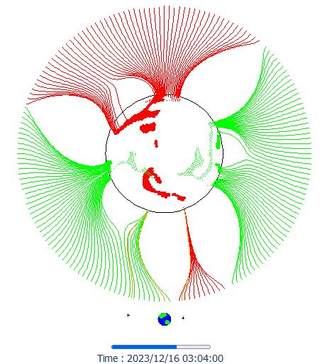 Afb: Dit is de actuele situatie in de magnetische verbinding tussen aarde en Zon van vrijdag 15-12. Voor onze tijd tel +1 uur op bij de tijd.