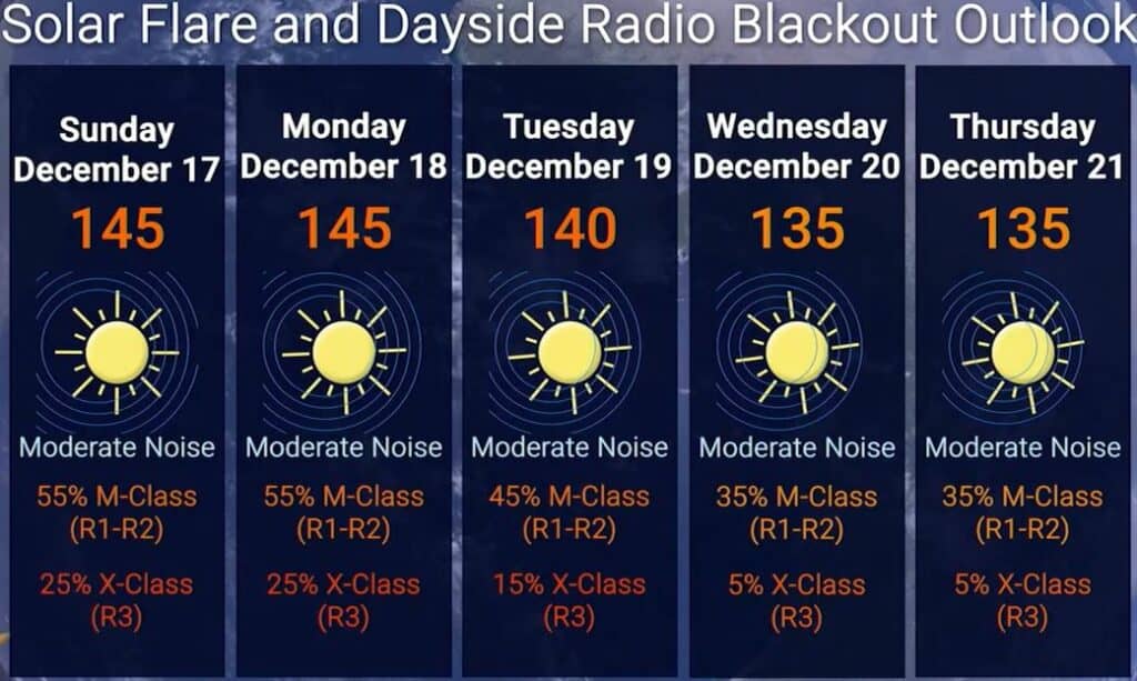 Afb: Dit is de verwachtingen voor de zonnevlammen voor de komende week. Men verwacht dat het nog langer zal doorgaan met hogere zonnevlammen.