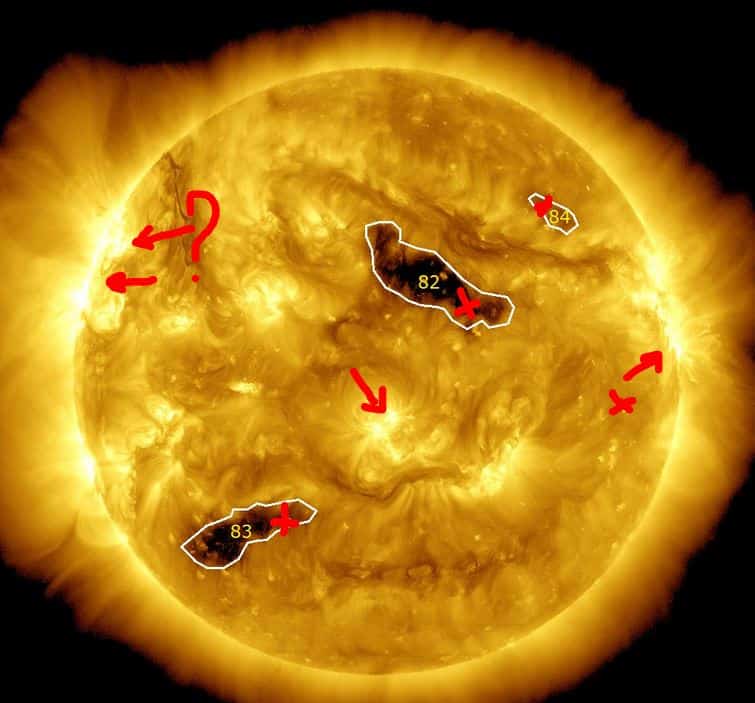 Er staan gaten in de corona van de Zon op de aarde gericht, maar geen extreem grote gaten (symptomen: hoge fluittonen/ruis in oren en hoofd en symptomen die lijken op die van zonnestormen).