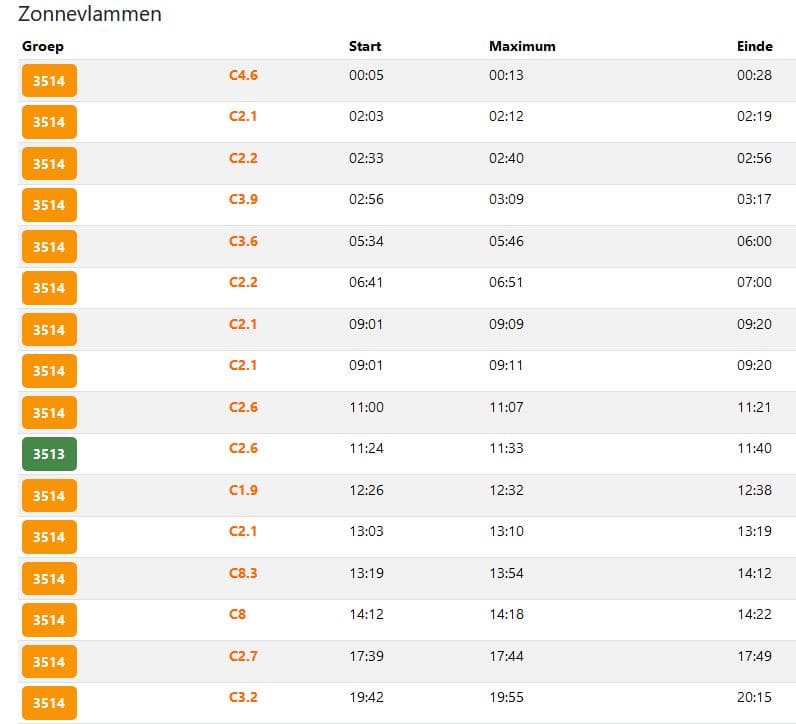 De heftige cluster van zonnevlammen rond de AR3514 staat op het uiterste puntje op de zijkant van de Zon en zal vannacht verdwijnen naar de achterkant. We zien dat de laatste hoge zonnevlammen tussen 15:00 en 16:00 uur was op zaterdag 16-12 geproduceerd door deze zonnevlek vanaf de rand van de Zon met een C-8.38. Daarna werd het rustig met de hoge zonnevlammen. Er staat nog wel een grote zonnevlam pal op de aarde gericht die voor intensiteit kan gaan zorgen en er komen nieuwe zonnevlekken in zicht (links) die in de vorige cyclus toen ze zichtbaar waren voor ons op aarde flink actief waren en dat nu nog steeds zijn. Dus ook voor de komende week worden er nog hoge zonnevlammen verwacht. Er is nog steeds een ZEER HOGE ZONNEVLAM ALERT met 55% M-klasse en 25% X-klasse en 30% protonenstorm kans.