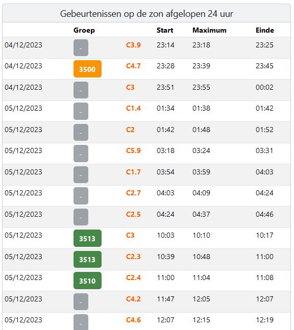 Afb: dit is de weergave van zonnevlammen van dinsdag 5-12. De M-1.58 rond 7:40 uur staat niet in de lijst, dus daarom nog even hier onder de aandacht. Ik verwacht dat deze vanaf de rand van de Zon kwam van AR3500. Deze zonnevlek verdwijnt na deze dinsdag naar de achterkant van de Zon.