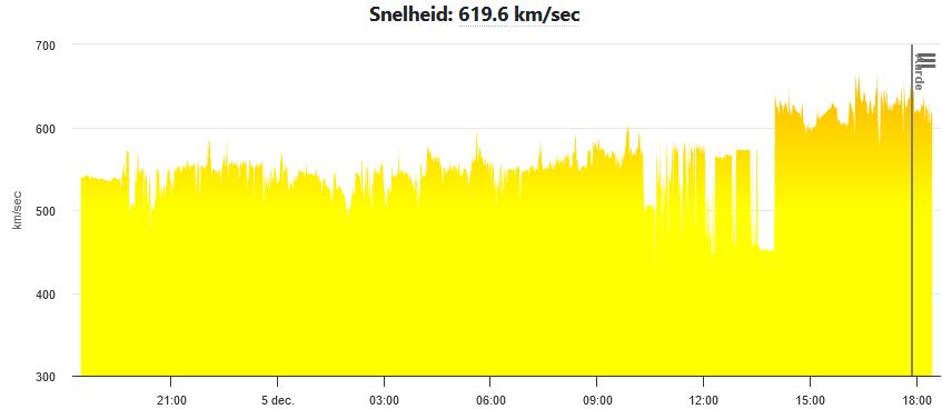 Afb: dit is de weergave van de zonnewind snelheid. Die loopt geleidelijk op gedurende de dag met het maximum rond 17:30 met ongeveer 660 km/sec. Dat is flink hoog en goed voelbaar met symptomen.