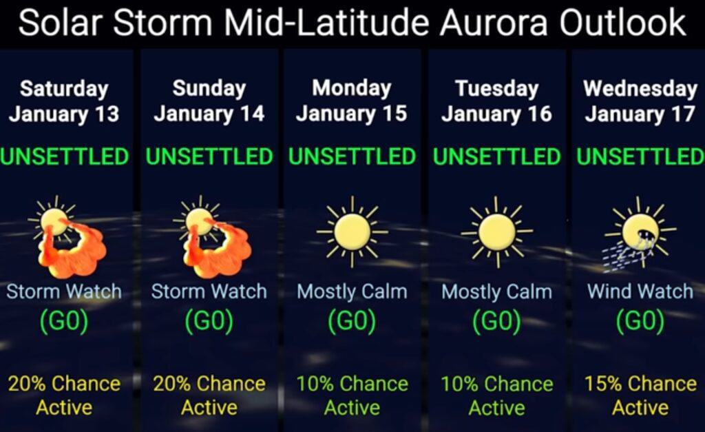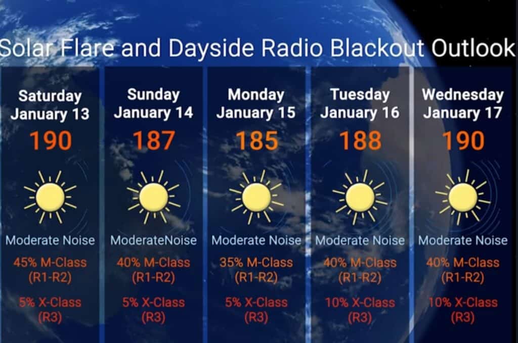 Afb: dit is de weergave van de vooruitzichten voor de komende week. Het ziet er vanaf woensdag 17-1 naar uit dat het nog rustiger gaat worden met nog maar 10% kans op grote zonnevlammen. Dat is niet in bovenstaande grafiek verwerkt.