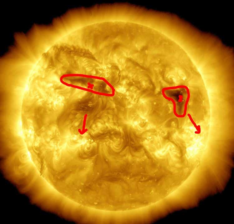 Afb: dit is de Zon gezien vanaf de aarde van dinsdag 16-1. De rode pijlen zijn de zonnevlekken die de kleine zonnevlammen produceren. De rode cirkels/vlakken met het kruis erin dat zijn de gaten in de corona. Die werden dit keer niet aangegeven en dus heb ik ze er zelf in getekend. Deze staan deels op de aarde gericht.